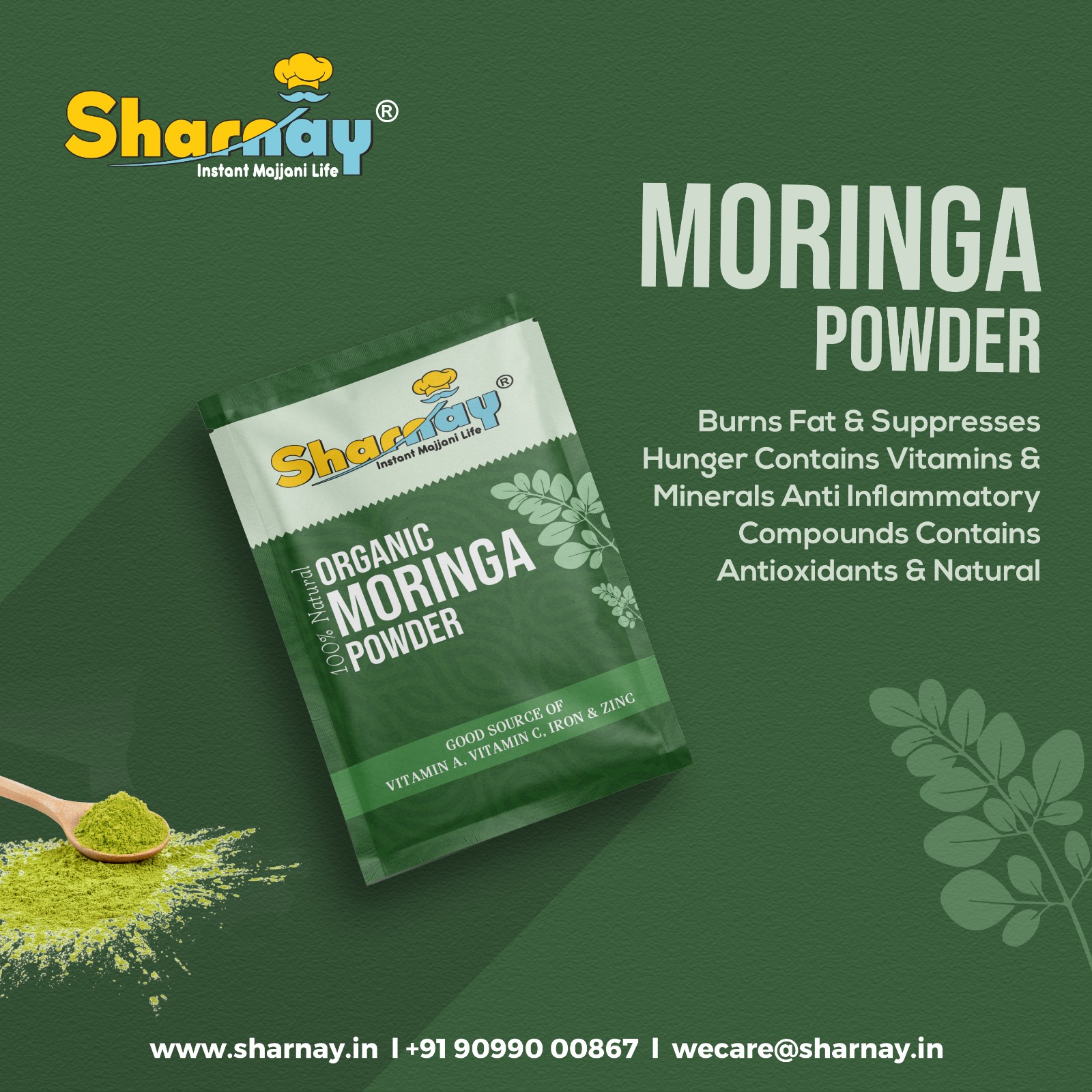 Boost your daily nutrition with Sharnay Moringa Powder (0.75gm)—a superfood packed with vitamins, minerals, and antioxidants. Known as the “Miracle Tree,” moringa is a natural source of vitamin C, calcium, potassium, protein, and iron, making it an excellent addition to your daily diet.